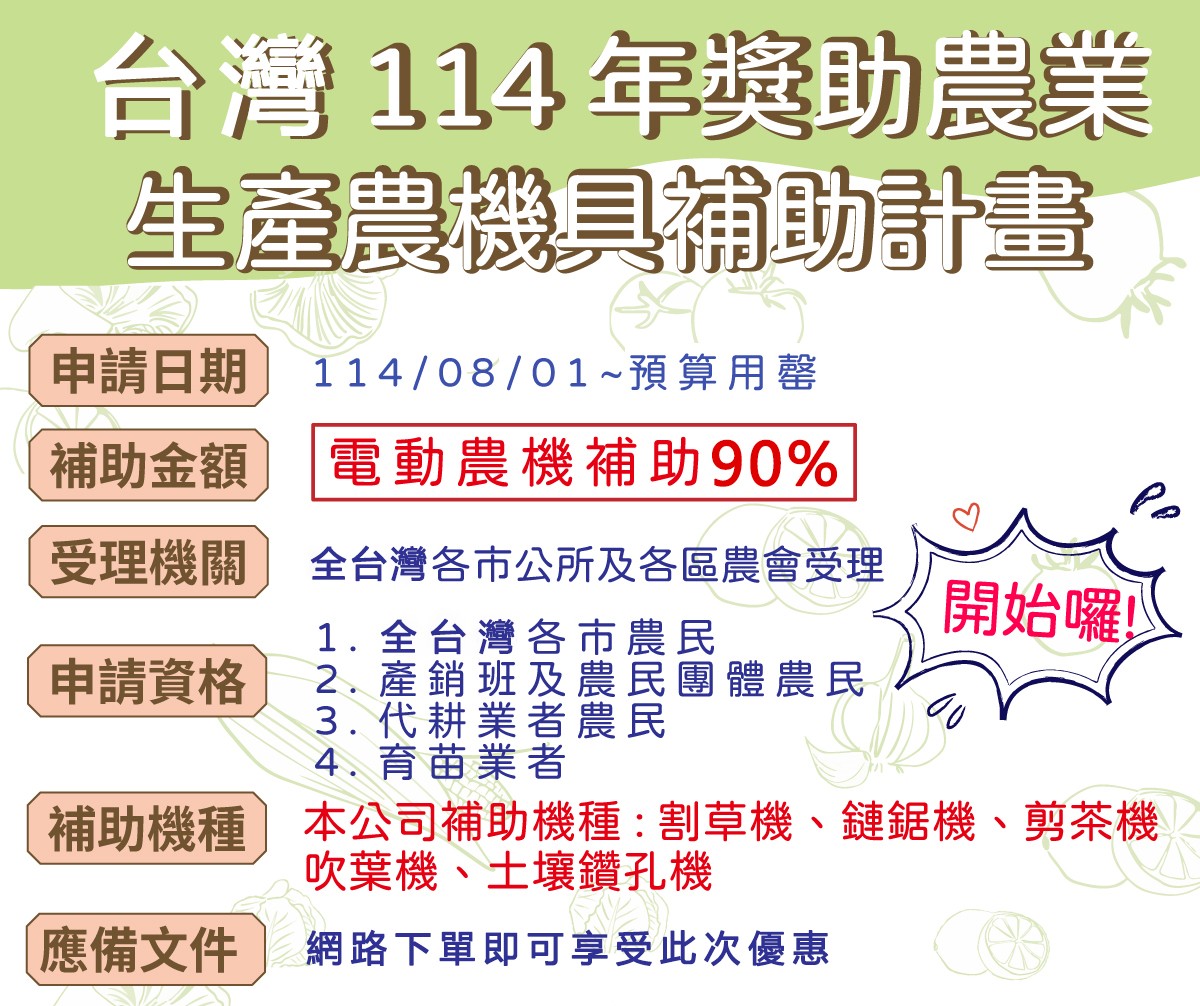 為了響應台灣政府的號召,现台灣東林公司决定开启线上農機補助计划,幫助農民朋友們!